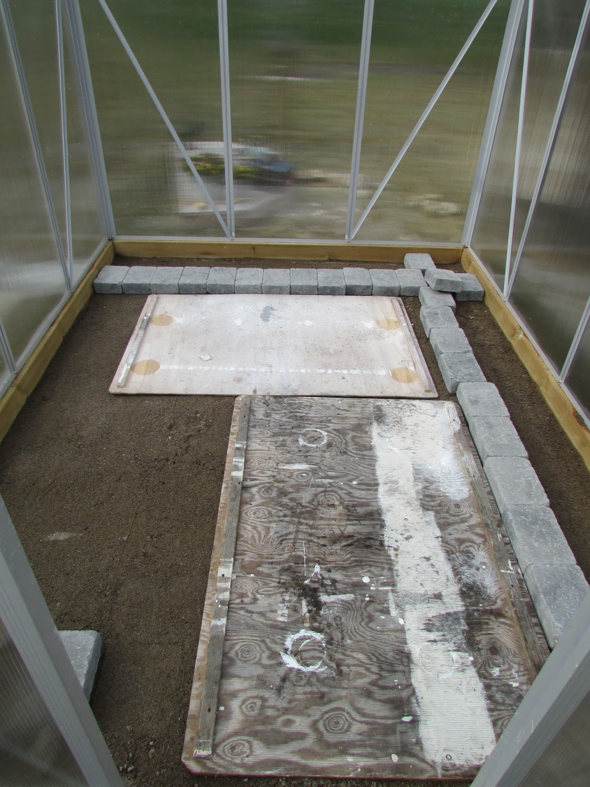 Det gamle gulvet ble fjernet, hullet ble fylt med sand, isopor og enda mer sand. Og tilslutt la de sten. Så nå har jeg et lekkert og isolert gulv i drivhuset. Herlig! Og ved hjelp av varmeovn og frostvakt er aldri temperaturen under 17 grader.